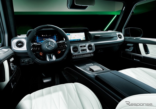 また、「AMGエクステリアナイトパッケージII」により、フロントおよびリアのスリーポインテッドスターやボンネット上のバッジなど随所をブラックパーツで統一し、細部にまで精巧さと特別感を付加している。加えて、フロントバンパートリムやアンダーガード(フロント・リア)、スペアタイヤカバー、サイドストリップラインなど、随所へカーボンパーツを配し、AMGのハイパフォーマンスを視覚的にも印象づけている。