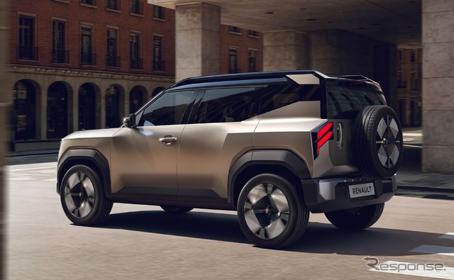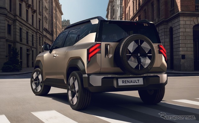 リア部分では、バックドアに装着されたスペアタイヤが、都市を離れて新たな領域へ向かう野心を表現している。ホイールアーチ、グリルのルノーのレタリング、ベージュデューンサテンのボディカラーが、重厚感と軽やかさのバランスを生み出している。