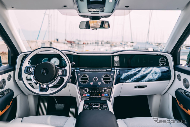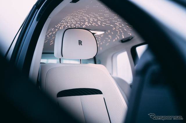 インテリアは、アークティック・ホワイトとネイビー・ブルーのレザーで仕立てられ、コントラスト・ステッチやパイピング、ヘッドレストのモノグラムにはネイビーがあしらわれている。シート・インサートには、ロールス・ロイスのシグネチャー・スレッドを用い、斜めの帯状に手縫いされたビスポークのリギング・パターンが施されている。