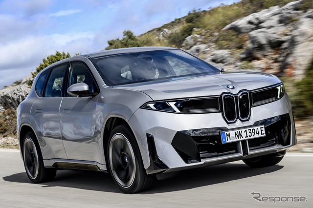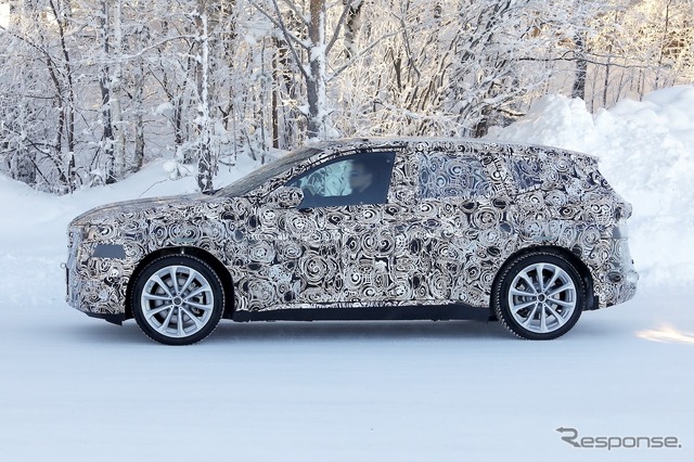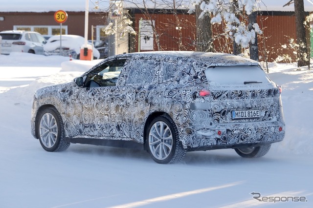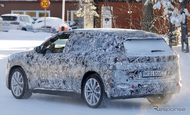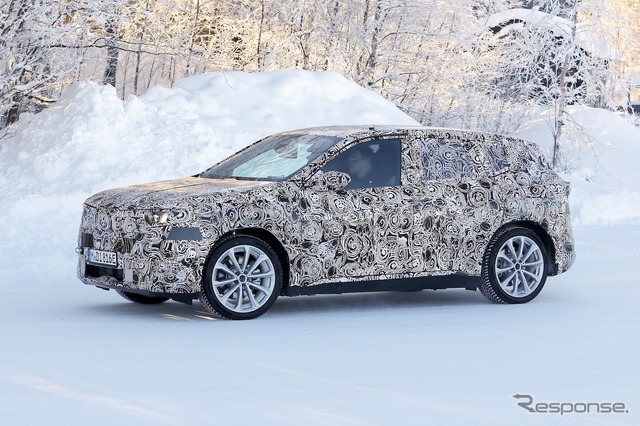新しいグリルに加え、ヘッドライトとバンパーも新設計となる。サイドビューも従来型 iX1より明らかにすっきりとした印象で、フラッシュドアハンドルが採用されている。リアビューは隠されているが、新型LEDテールライトの一部が確認できる。