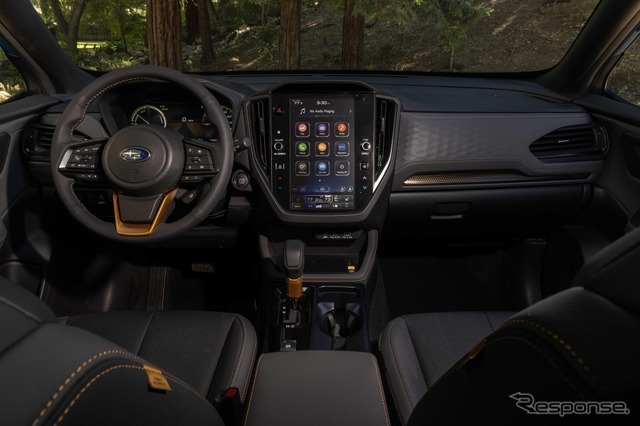 フォレスター ウィルダネス ハイブリッドは、非ハイブリッドモデルと同じ9.3インチの最低地上高、X-MODEデュアルモードシステム、スバル シンメトリカル全輪駆動(AWD)、強化サスペンション、オールテレーンタイヤを維持しつつ、燃費性能の向上と市街地走行での快適性を高めるインテリアの改良も施されている。
