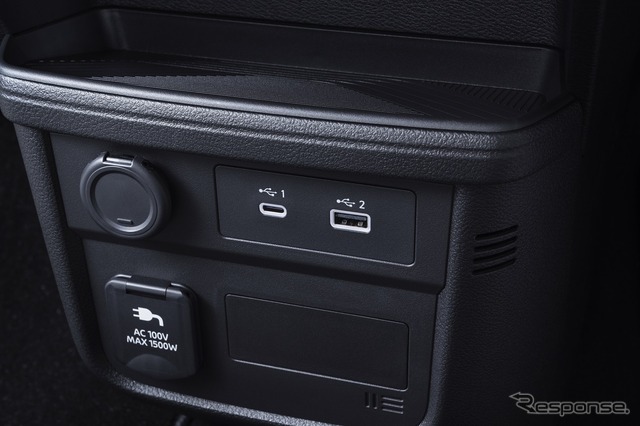 充電ポートリッドや充電コネクタにいたずら防止のロック機構を追加。また、100V AC電源(1500W)をラゲッジルームとインストルメントパネルの2か所に設定し、家電製品の使用だけでなく、災害時や企業のBCP対策における移動可能な給電車としての活用も可能とした。