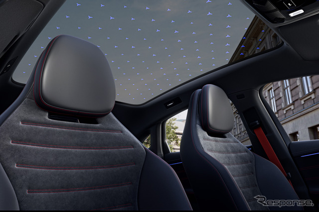 オプションのアンビエントライティングはインストルメントパネルからドア全体、さらにオプションの「スカイコントロール」パノラミックルーフまで広がり、162個の発光スターが天井を個性的な星空に演出する。