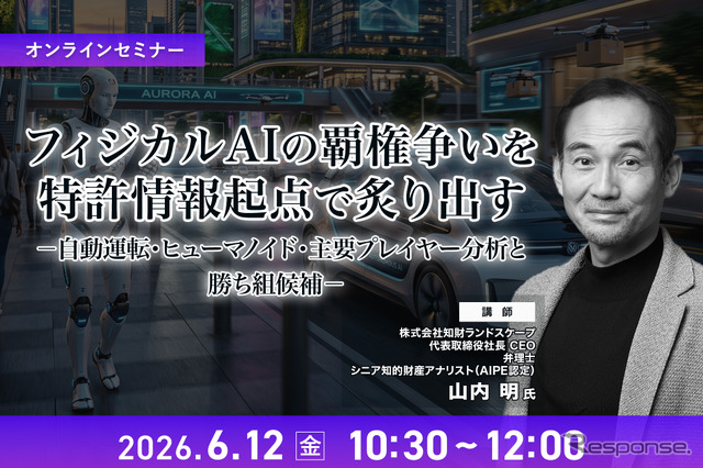 株式会社イードは、「フィジカルAIの覇権争いを特許情報起点で炙り出す-自動運転・ヒューマノイド・主要プレイヤー分析と勝ち組候補-」を2026年6月12日(金)に開催します。開催前日(土日祝の場合は前営業日)の夕刻に視聴のためのご案内を準備いたします。ログイン後マイページよりご確認ください。